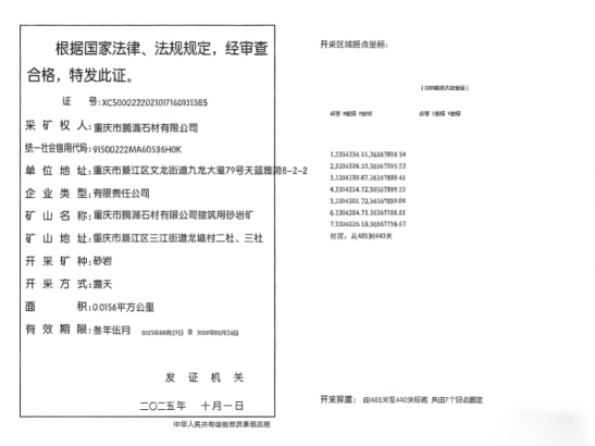 你司申请办理重庆市鹏瑞石材有限公司建筑用砂岩矿采矿权续期登记、延续许可,已经审查批准,现颁发不动产权证书(采矿权)、采矿许可证。