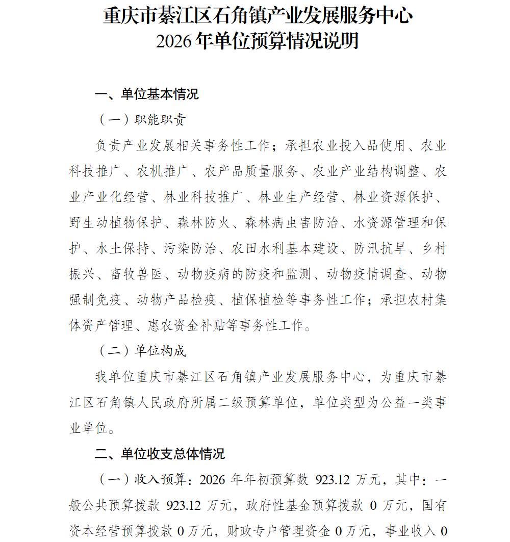重庆市綦江区石角镇产业发展服务中心2026年单位预算情况说明