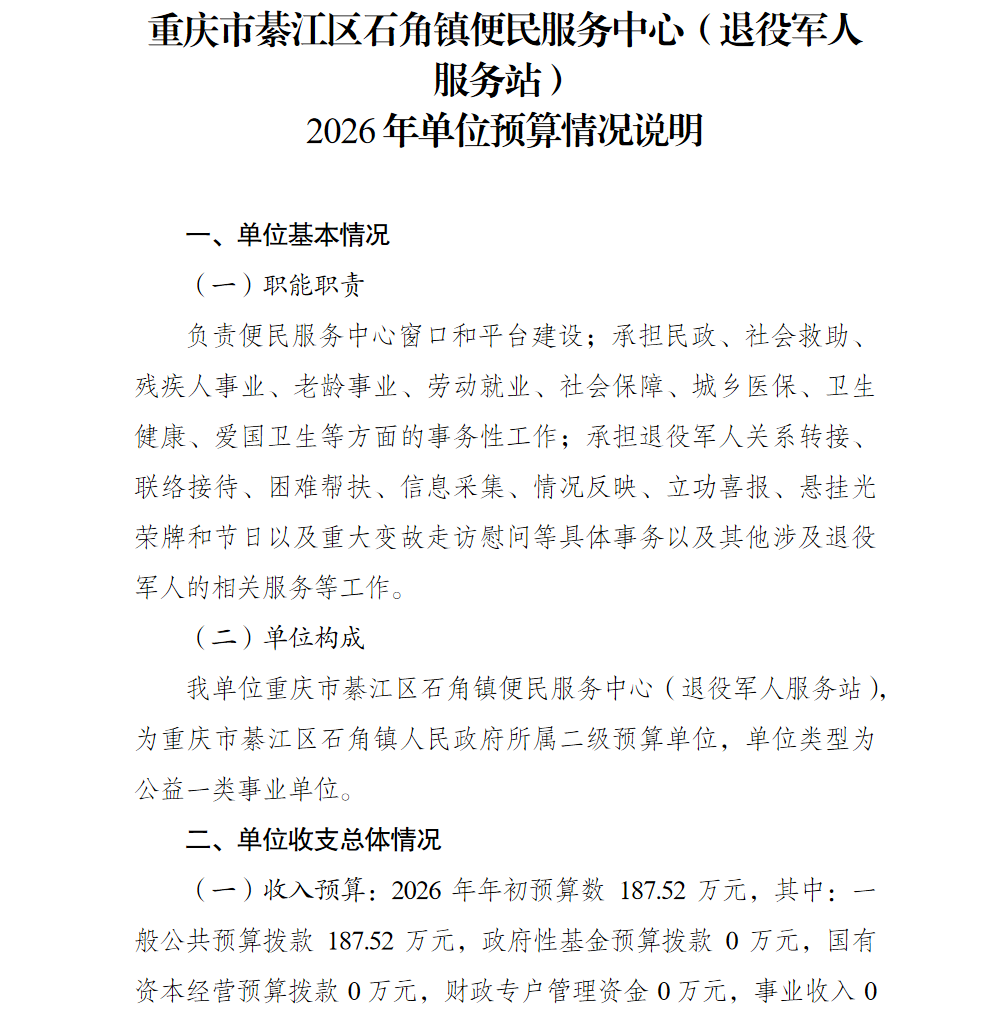 重庆市綦江区石角镇便民服务中心(退役军人服务站) 2026年单位预算情况说明