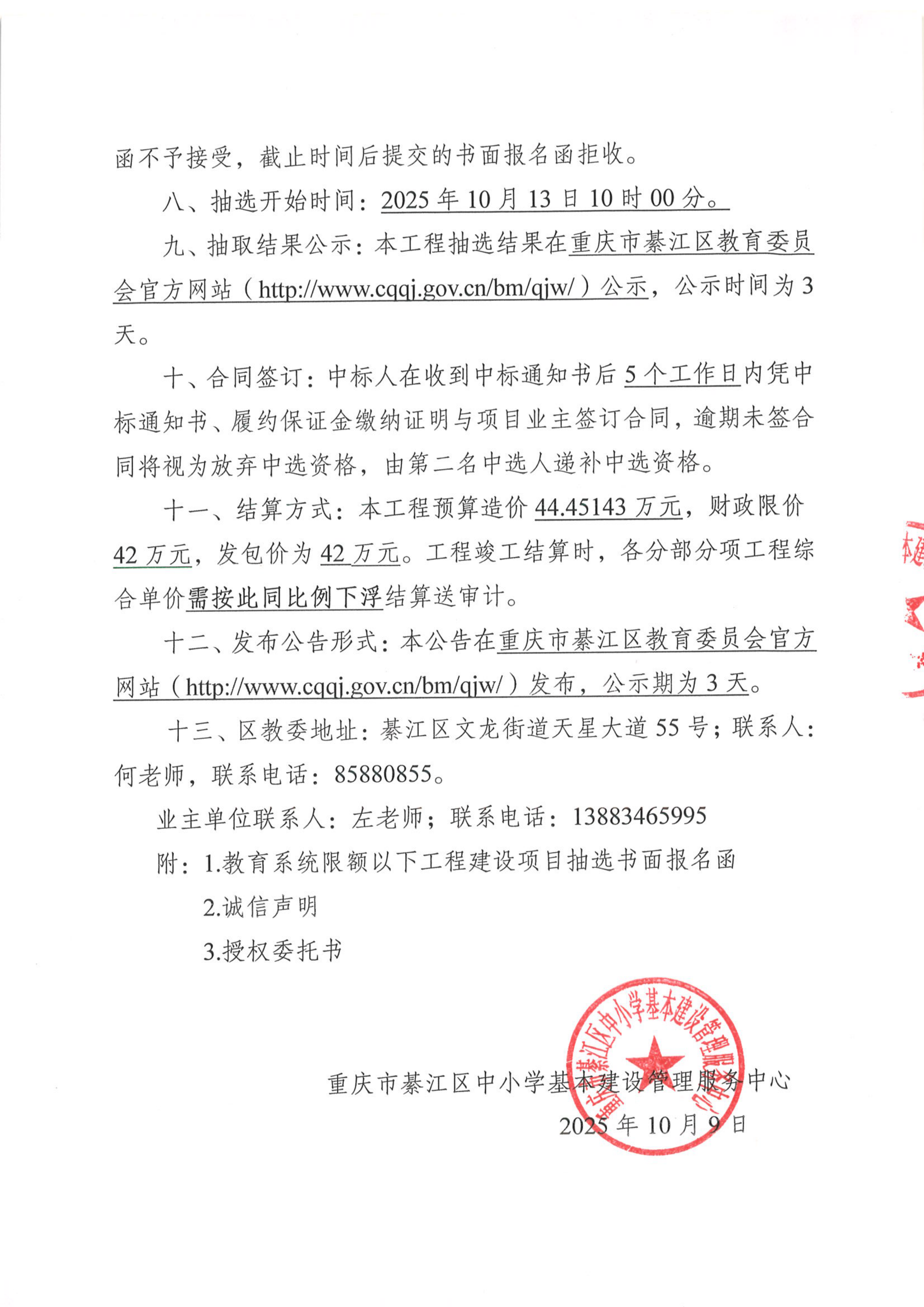 綦江区石壕小学附属幼儿园场地扩建工程抽选公告