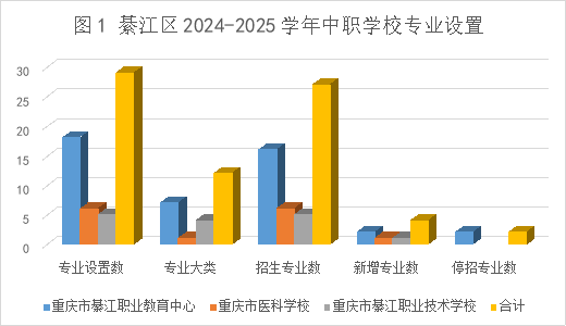 2024-2025学年,綦江区中等职业学校共开设“医药卫生、装备制造、教育与体育、电子与信息、财经商贸、旅游、文化艺术、交通运输、资源环境与安全”9个专业大类29个专业,招生专业27个。根据区域产业布局和招生实际,2024-2025学年新增中餐烹饪、电气设备运行与控制、医学检验技术、应急救援技术等4个专业,休闲体育服务与管理、市场营销等2个专业停止招生。