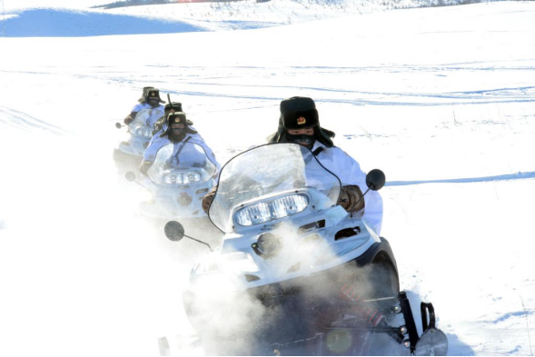 北部战区陆军某旅三角山边防连官兵驾驶摩托雪橇执勤。新华社发(2014年1月摄)