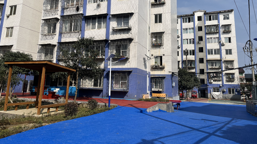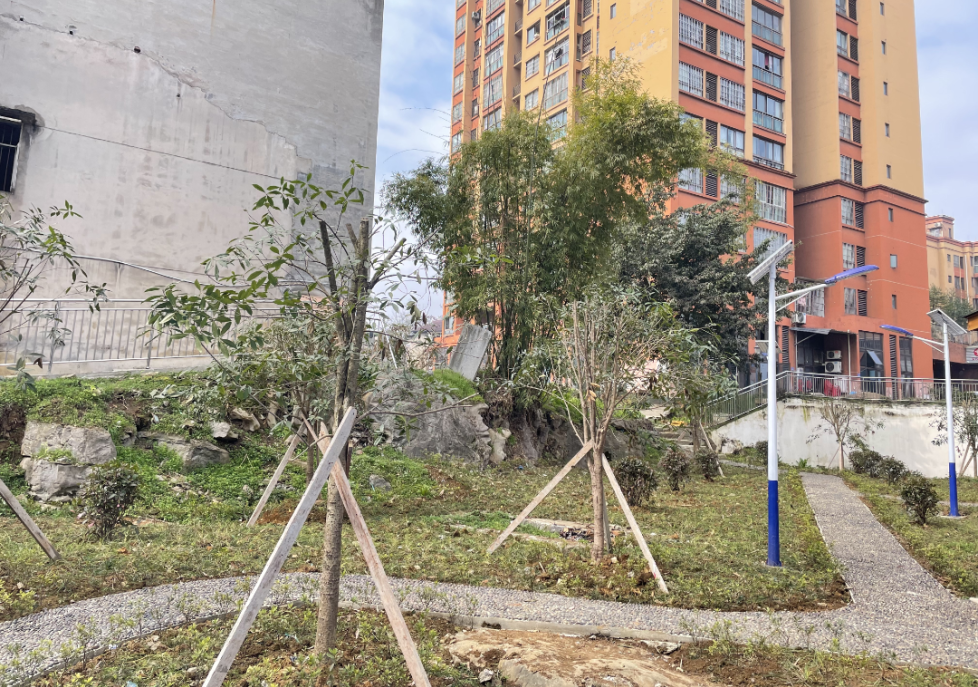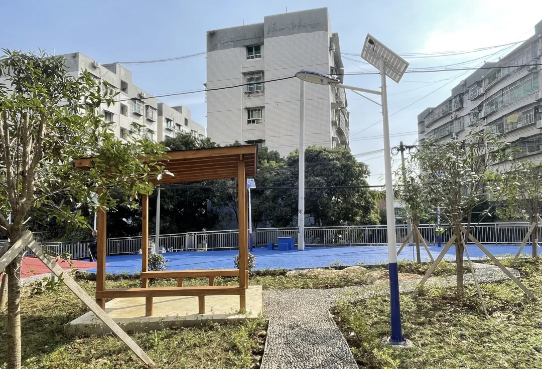 在改造过程中,打通镇重点聚焦“生态+便民”两大需求:一方面打通小区内分散地块,精心规划打造连贯景观带,新增绿化面积约650平方米,栽种乔木20余株,搭配500余平方米灌木及地被植物,让小区实现“春有花、夏有荫、秋有叶、冬有绿”。另一方面同步建设多功能活动区域,贴心配备休憩座椅、健身器材、避雨凉亭等设施,满足不同年龄段居民的休闲需求。