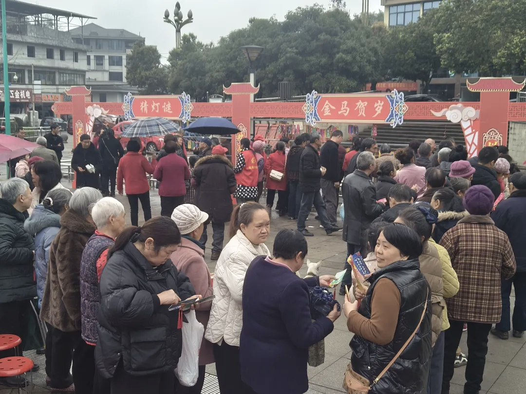 游园现场,五彩灯谜、摸福字、套圈等趣味项目依次亮相。灯谜内容涵盖文史知识、政策理论等多个方面,既内涵丰富又妙趣横生,居民们热情参与,互动频频,在轻松有趣的游戏中增进了邻里情谊。不同区域还分别开展吹元宵、夹元宵、传元宵等特色活动,处处充满欢乐与活力。