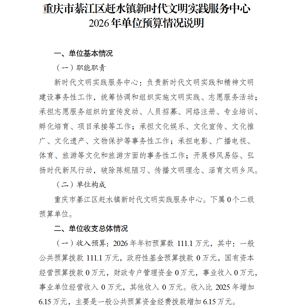 重庆市綦江区赶水镇新时代文明实践服务中心2026年单位预算情况说明