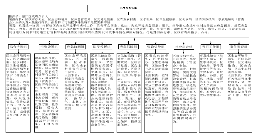 区应急指挥部下设综合协调、污染处置、应急监测、医学救援、应急保障、舆论引导、社会稳定、善后工作、事件调查等工作组(职责见附件2)。