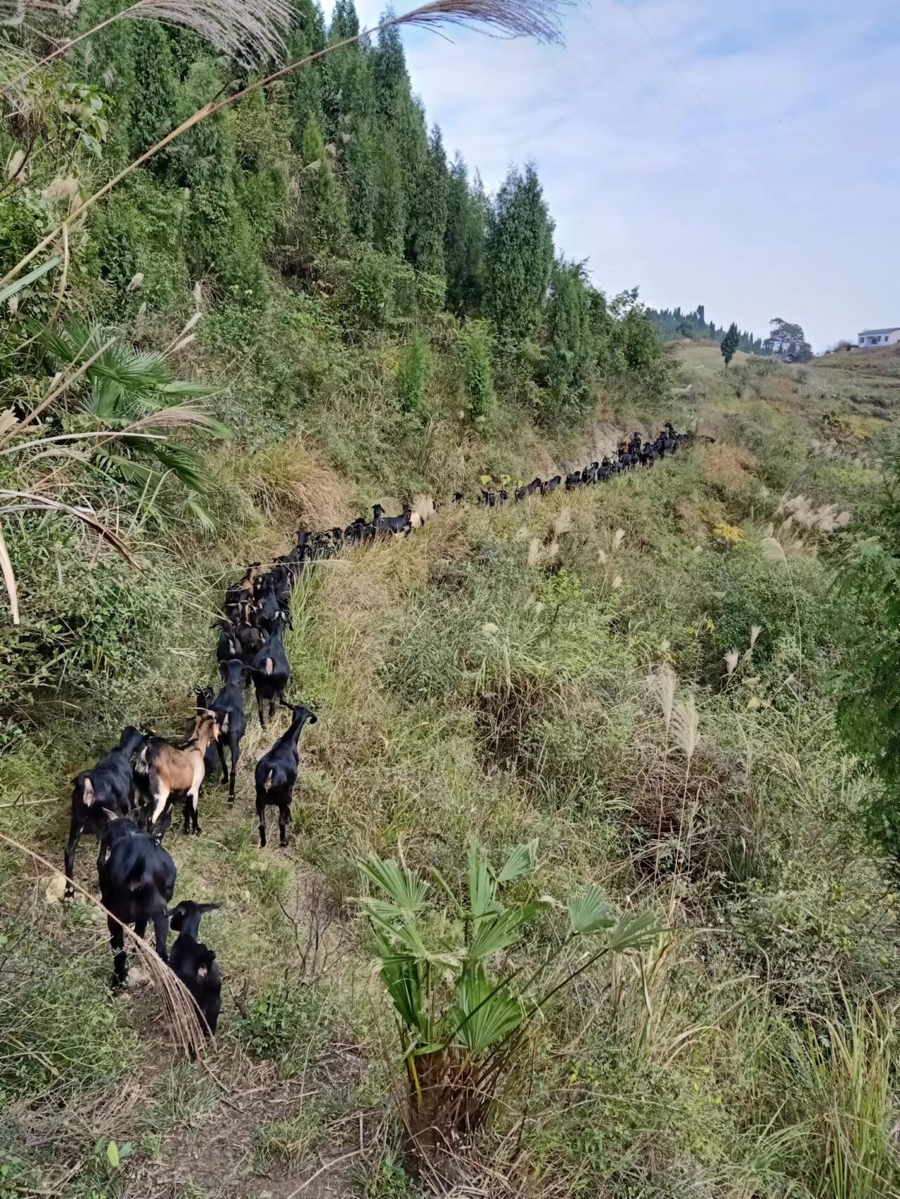 “咩,咩咩......”未见站在羊舍门前岔路口的文联先有什么明显指令,鱼贯而出的160多只黑山羊似乎明白主人意图,一字排开经主人面前向山林间的小道滚滚而去了。