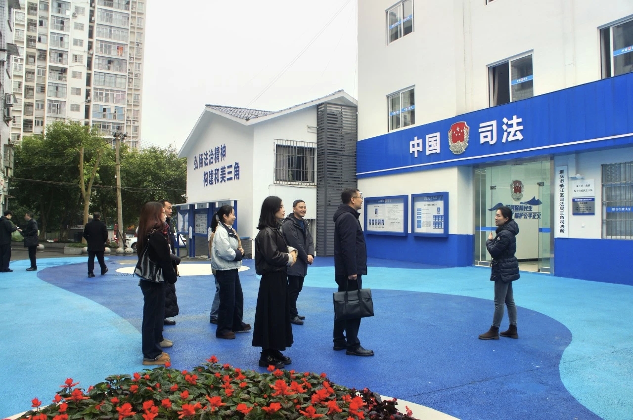 随后,调研组深入三角镇平安法治综合实践基地,实地走访公共法律服务窗口、矛盾纠纷调解室、法治宣传院坝等功能区域,并详细了解了三角镇“综合执法+司法行政”有机结合新治理模式的运行情况。王爱国教授对实践基地在全国率先建立乡镇综合执法大队与司法所“基地化”合署办公、“一体化”协同共治的运作模式表示肯定,对其打造的“三角镇‘管执服’一体化智治场景”应用非常认可,认为其打通了基层法治建设和基层治理能力现代化提升的“最后一公里”,形成了法治系统赋能基层治理的“綦江样板”。