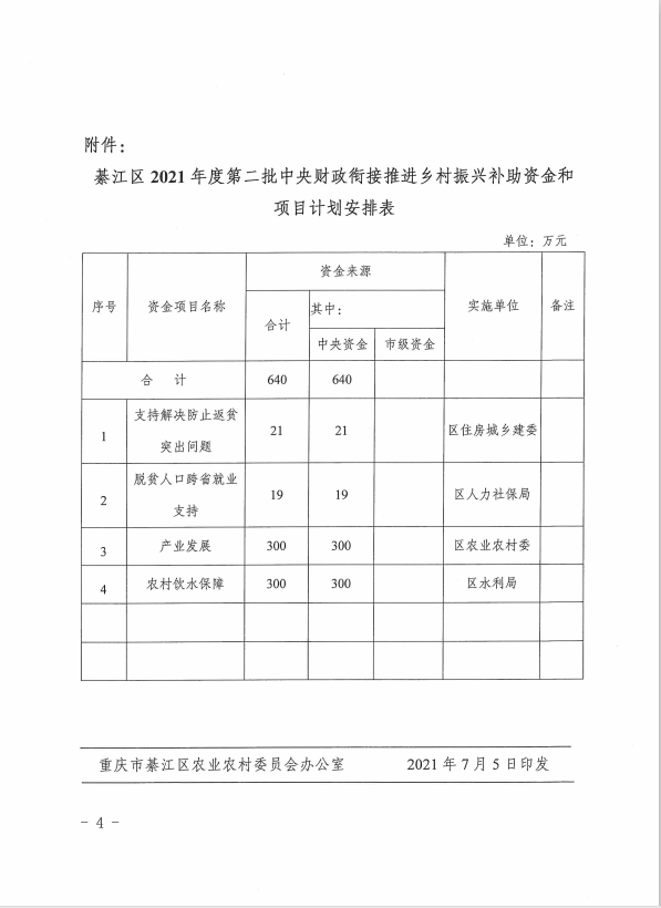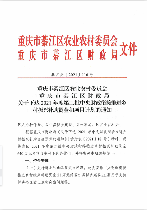 綦江区农业农村委綦江区财政局关于下达2021年度第二批中央财政衔接推进乡村振兴补助资金和项目计划的通知