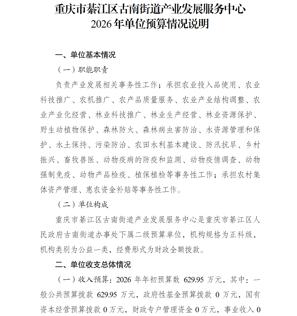 重庆市綦江区古南街道产业发展服务中心2026年单位预算情况说明