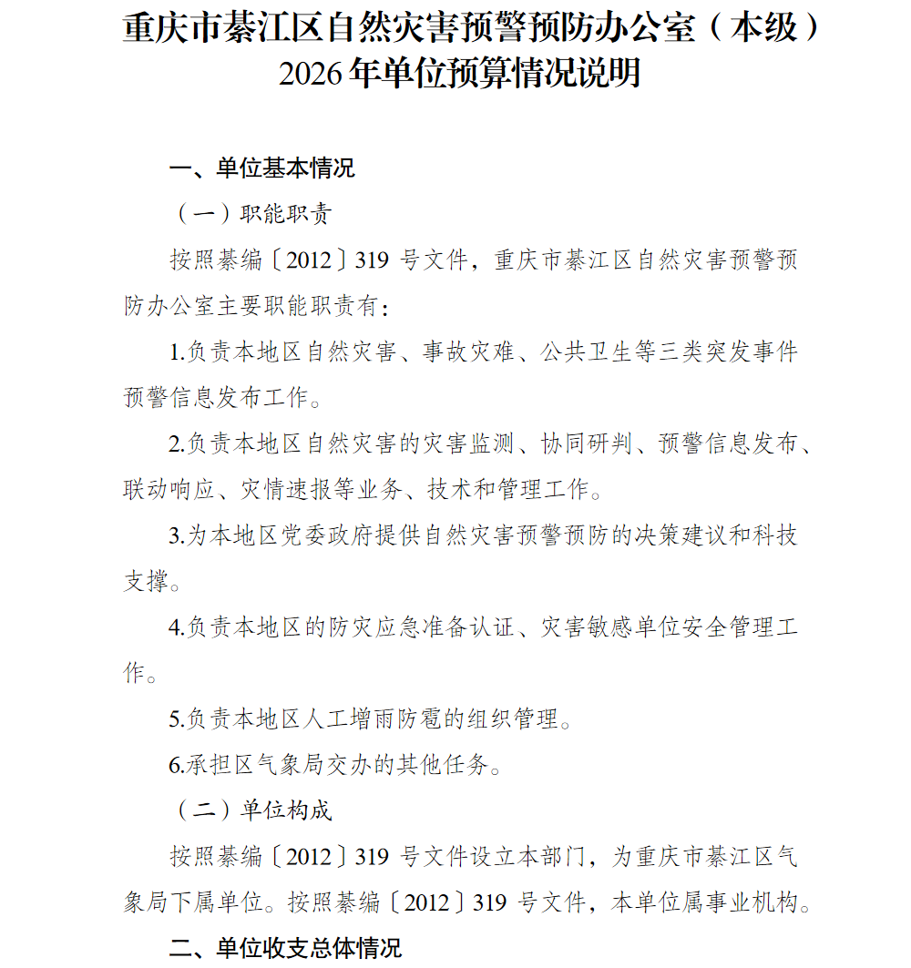 重庆市綦江区自然灾害预警预防办公室(本级)2026年部门预算情况说明