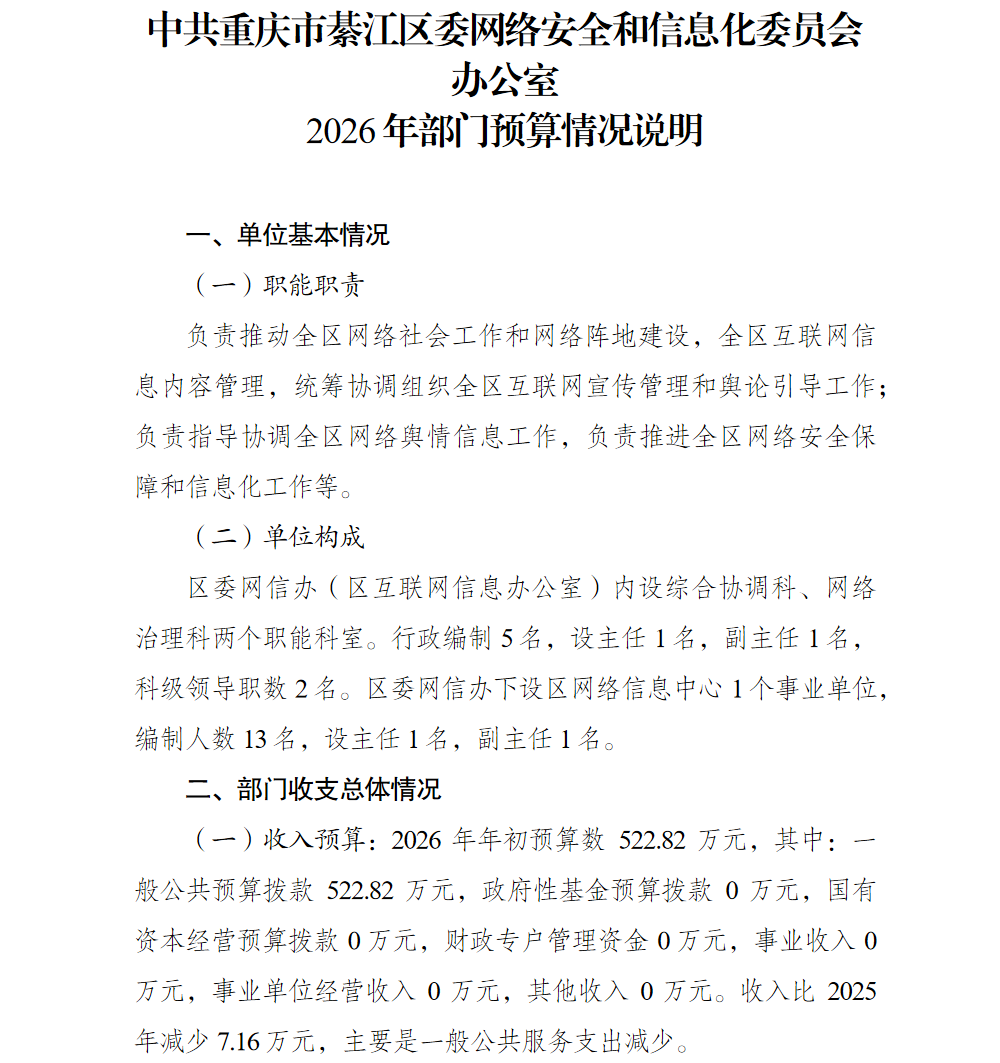 中共重庆市綦江区委网络安全和信息化委员会办公室2026年部门预算情况说明