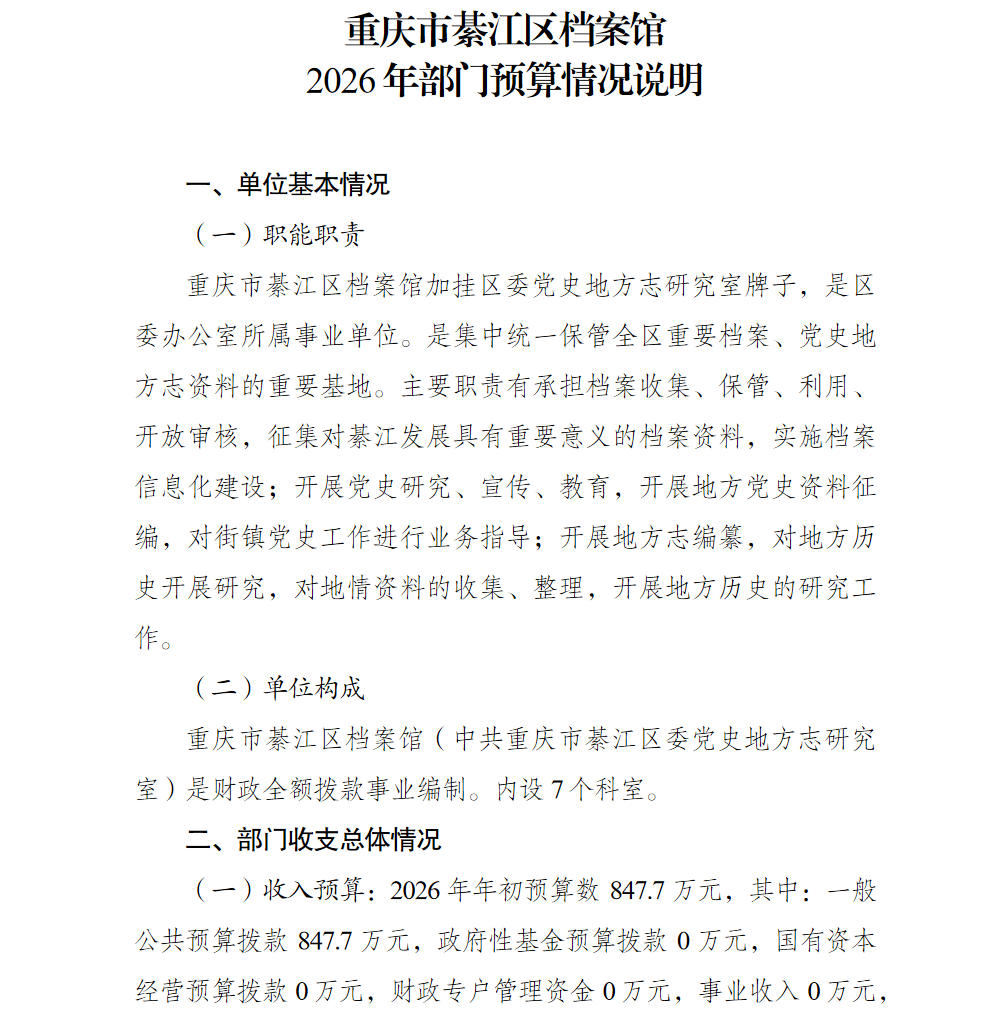 重庆市綦江区档案馆2026年部门预算情况说明