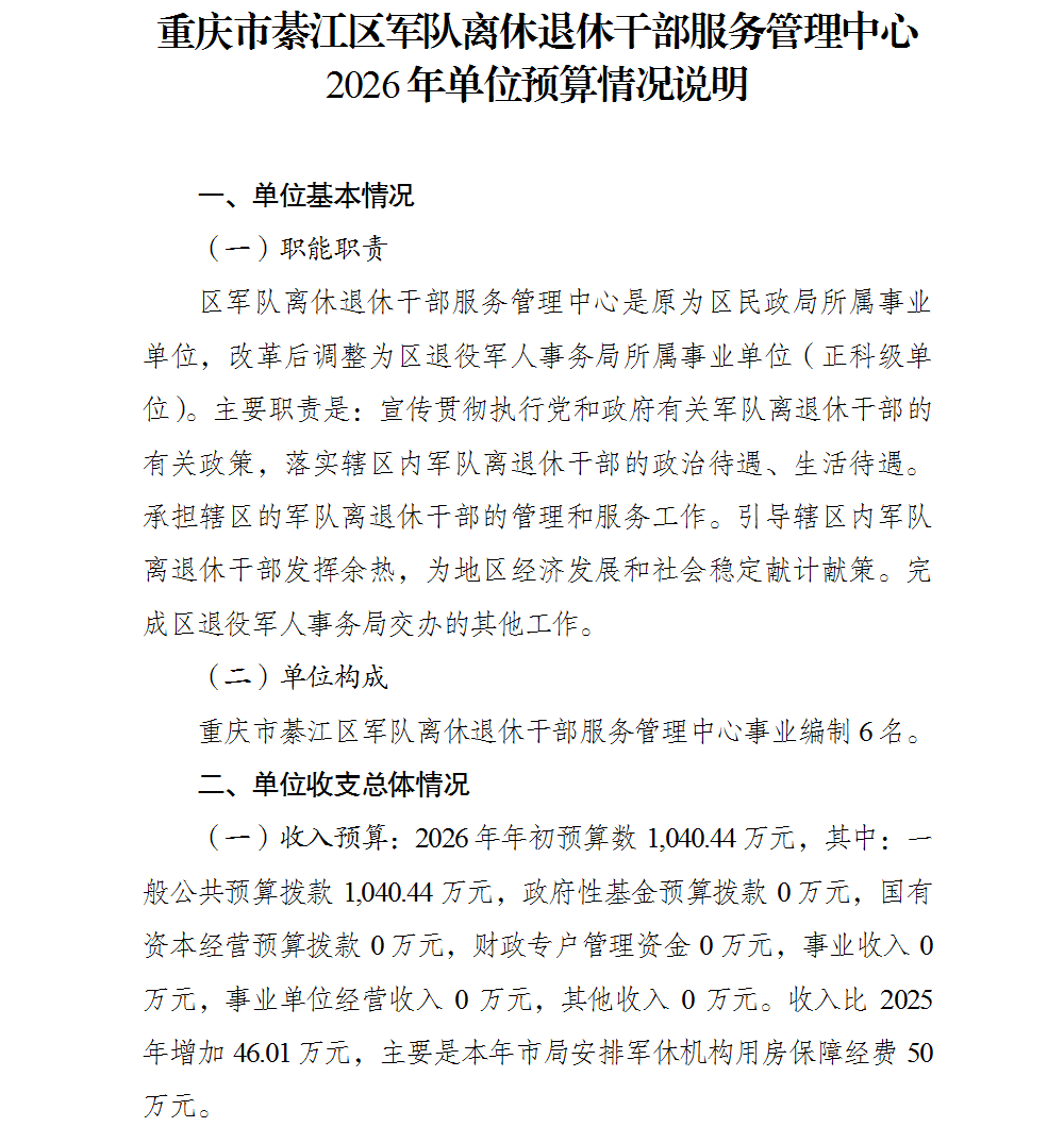 重庆市綦江区军队离休退休干部服务管理中心_2026年单位预算情况说明