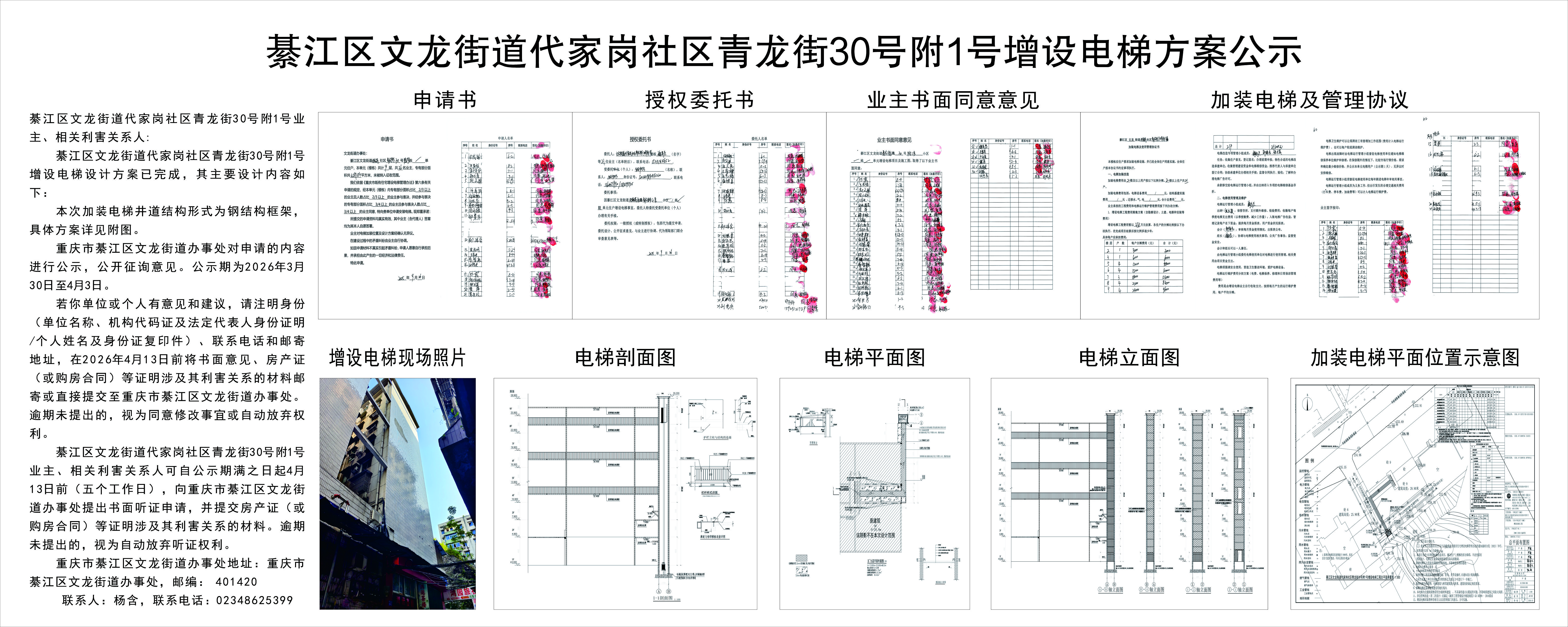 綦江区文龙街道代家岗社区青龙街30号附1号增设电梯方案公示